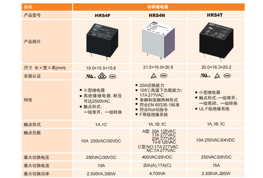 功率继电器 HRS4F 特性: ■小型继电器 ■高绝缘继电器,耐压可达2500VAC ■触点形式:一组常开、一组转换