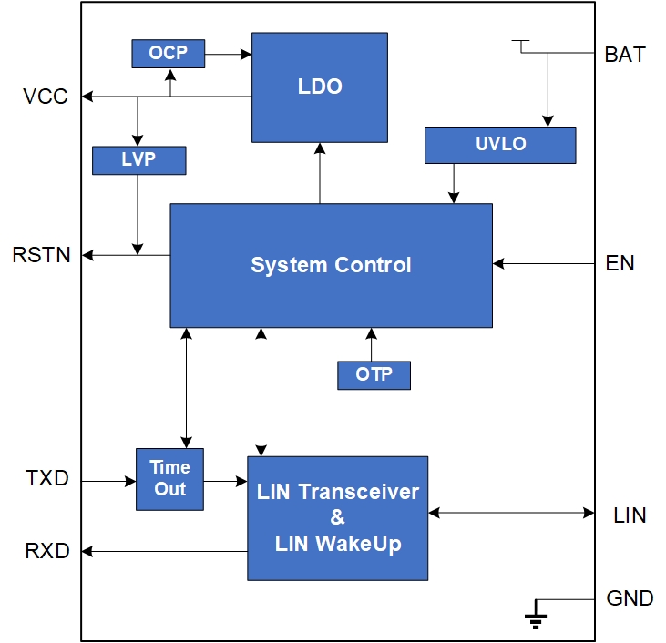 • 支持 LIN/BAT 管脚±8KV ESD
